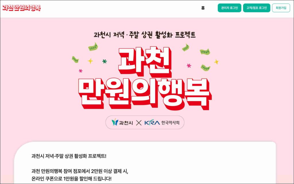 과천 만원의행복은 과천시와 한국마사회가 손잡고 만든 지역 소비 진작 캠페인이다. 행사 이름처럼 단돈 만원으로 행복을 누리게 하자는 취지인데, 그게 단순한 캐치프레이즈가 아니라 실제로 만원을 할인해주기 때문에 꽤 실속 있다. 물론 무조건 할인을 받는 건 아니고, 2만원 이상 결제하고 행사 참여 점포에서 쿠폰을 보여줘야 한다. 이 쿠폰은 행사 전용 웹사이트인 10000happy.co.kr에서 발급받을 수 있다.