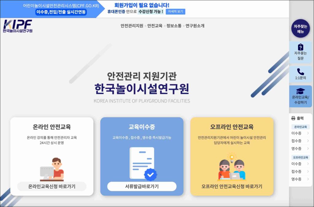 이 기관은 어린이놀이시설 안전관리 지원기관으로서 지정되어 있으며, 어린이놀이시설을 운영하거나 관리하는 담당자들을 위한 교육과 점검을 주로 담당합니다. 예를 들어 법정 의무교육에 해당하는 안전관리자 교육을 제공하고 있고, 오프라인뿐 아니라 온라인 과정도 운영하고 있어 비교적 유연하게 수강할 수 있는 구조입니다. 휴대폰 인증을 통해 간편하게 수강 신청이 가능한 점도 특징입니다