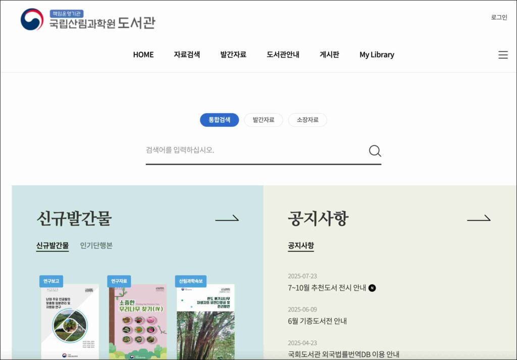 국립산림과학원 도서관 (book.nifos.go.kr)은 산림 분야의 연구자료와 간행물을 디지털과 물리 공간에서 복합적으로 제공하는 지식 인프라이에요.