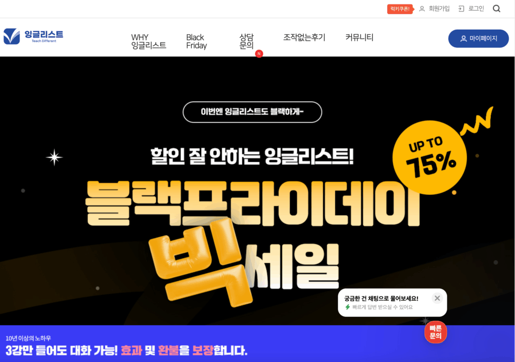 잉글리스트라는 이름을 처음 들으면 조금 생소할 수도 있는데, 막상 사이트를 들어가 보면 꽤 탄탄하게 구성된 영어 학습 서비스라는 걸 바로 느끼실 거예요. 전체적인 분위기가 “영어를 제대로 다시 시작하고 싶은 사람들”에게 꽤 잘 맞춘 느낌이더라고요.