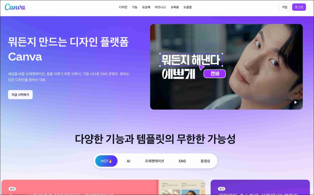 가장 큰 특징은 템플릿 기반의 디자인입니다. 초대장, 발표 자료, 소셜미디어 이미지, 포스터, 배너, 명함, 로고, 동영상 썸네일까지… 만들고 싶은 형식이 있다면 캔바에는 이미 수많은 템플릿이 준비돼 있습니다. 예쁘고 보기 좋은 템플릿을 골라서 텍스트와 이미지, 색상만 바꿔도 완성도 높은 결과물을 만들 수 있습니다. 그래서 디자인 경험이 전혀 없는 사람이라도 부담 없이 시작할 수 있습니다.